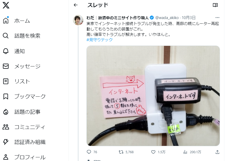 先日、X(旧Twitter)に「実家の高齢親にルーター再起動してもらうための装置」写真を投稿したところ、なんと200万閲覧・リツイート5700回以上・1.5万いいねをもらってしまいました。