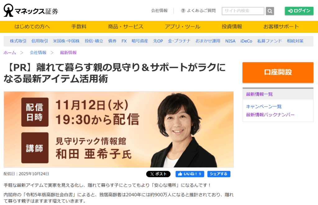 マネックス証券「離れて暮らす親の見守り&サポートがラクになる最新アイテム活用術」(2025年11月12日)